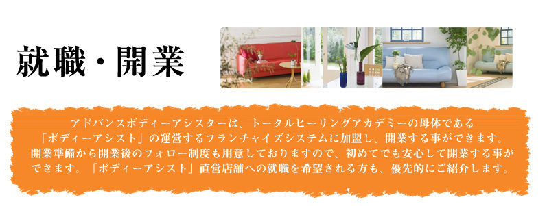 アドバンスボディーアシスターは、トータルヒーリングアカデミーの母体である「ボディーアシスト」の運営するフランチャイズシステムに加盟し、開業することができます。