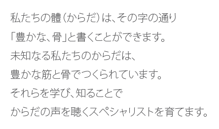 私たちは、「こころ」と「ことば」の交流を大切にこの学校運営に携わっていきたいと思っています。「信頼」という言葉は、私達整体師にとって必ず必要な言葉です。